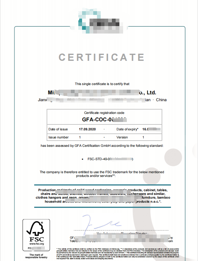 漳州市XX区XX家具有限公司FSC证书