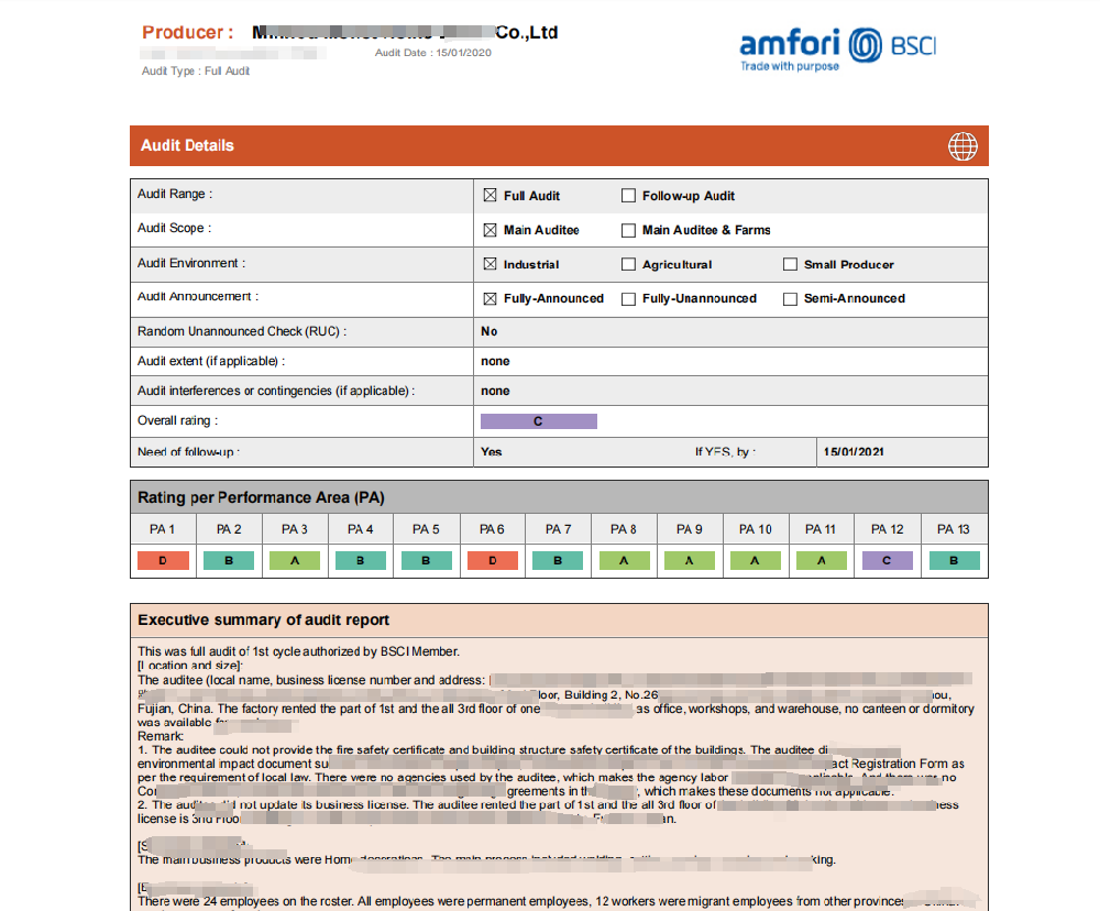闽侯县XX家具饰品有限公司BSCI认证证书
