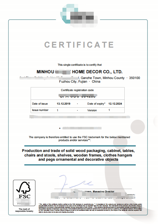 闽侯县XX家具饰品有限公司FSC证书