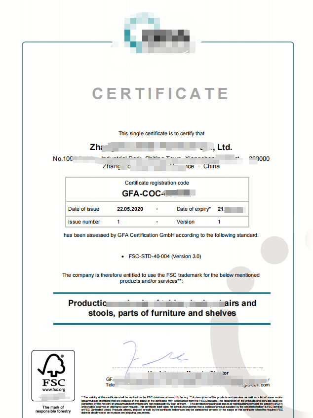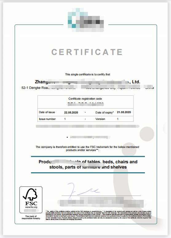 漳州市XX区XX家具有限公司FSC证书